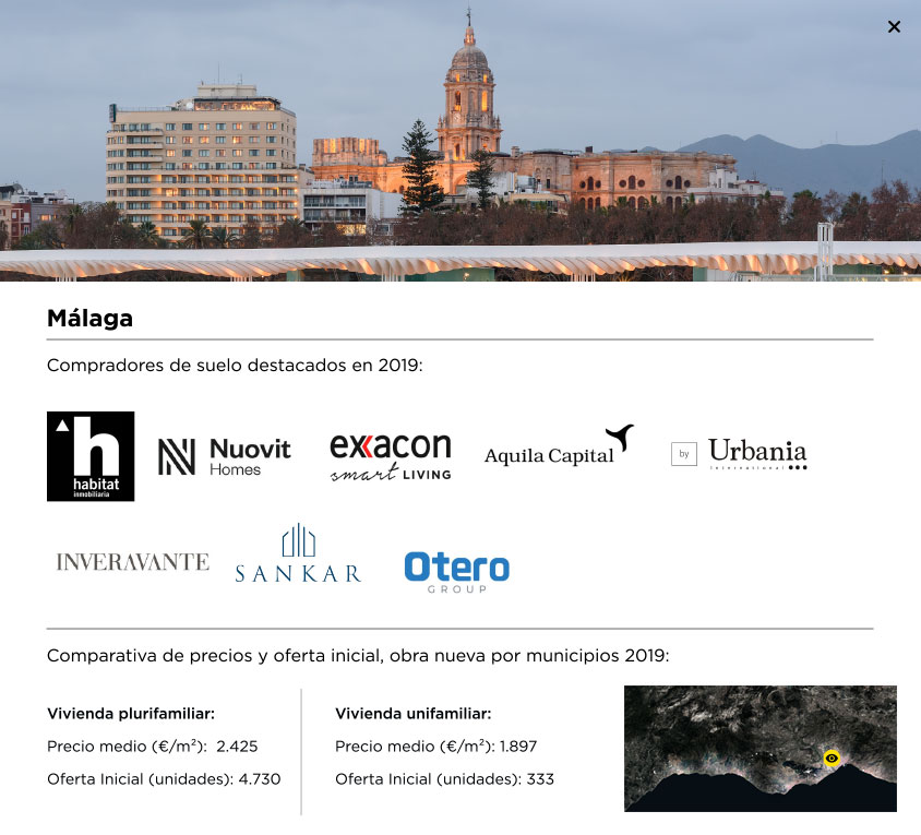 En un contexto a nivel general adverso en 2020 el mercado se ha mantenido dinámico. Durante el año se han creado las condiciones para que tras la normalización sanitaria se produzca una explosión a nivel transaccional en términos de suelo. Los ámbitos urbanísticos para el desarrollo de proyectos residenciales mas atractivos en la ciudad; Cortijo Merino, Sanchez Blanca, Nereo, El Tinto, Repsol o Rojas Santa Tecla. A nivel transaccional el máximo precio alcanzado se ha registrado por suelo finalista en Málaga-Este (1.500 €/m²t) Por otro lado, esperamos que una vez finalice la campaña de vacunación y se regularice el tráfico de vuelos desde los distintos países origen de demanda, el mercado de suelo en general y de manera especifica en Costa del Sol experimentara un nivel de actividad muy importante.